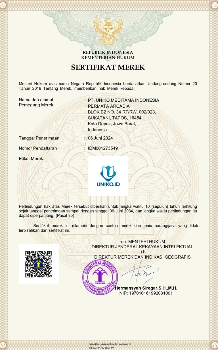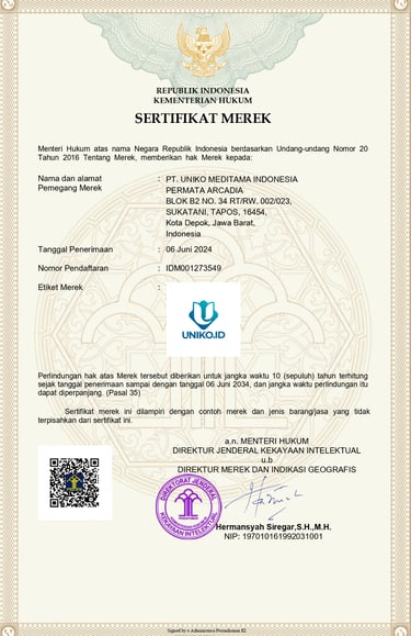 UNIKO.ID telah resmi terdaftar sebagai merek di bawah perlindungan hukum Republik Indonesia, berdasarkan Sertifikat Merek Nomor IDM001273549. Sertifikasi ini diterbitkan oleh Direktorat Jenderal Kekayaan Intelektual (DJKI) sebagai bukti bahwa UNIKO.ID merupakan entitas sah yang memiliki identitas dagang yang terlindungi secara hukum.