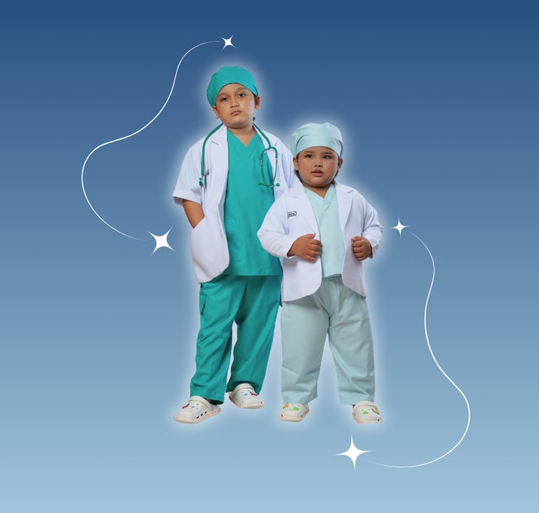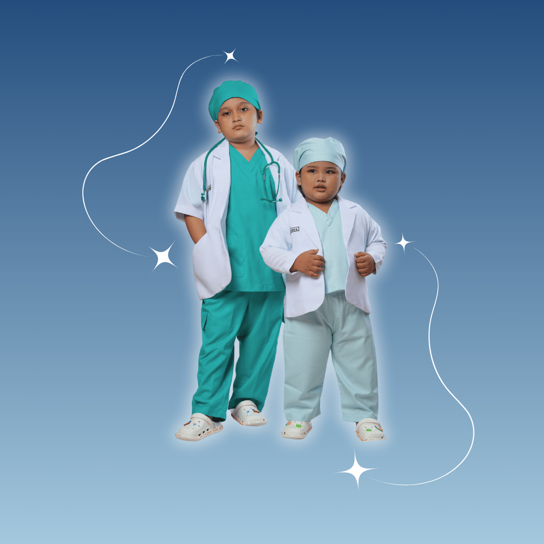 Kostum lucu dan edukatif untuk si kecil yang ingin tampil seperti dokter sungguhan. Dilengkapi setelan scrub dan jas putih khas tenaga medis, bahan lembut dan nyaman dikenakan seharian. Cocok untuk kegiatan bermain peran, edukasi profesi, hingga lomba kostum. Membantu menumbuhkan rasa percaya diri dan mengenalkan dunia kesehatan sejak dini dengan cara yang menyenangkan.